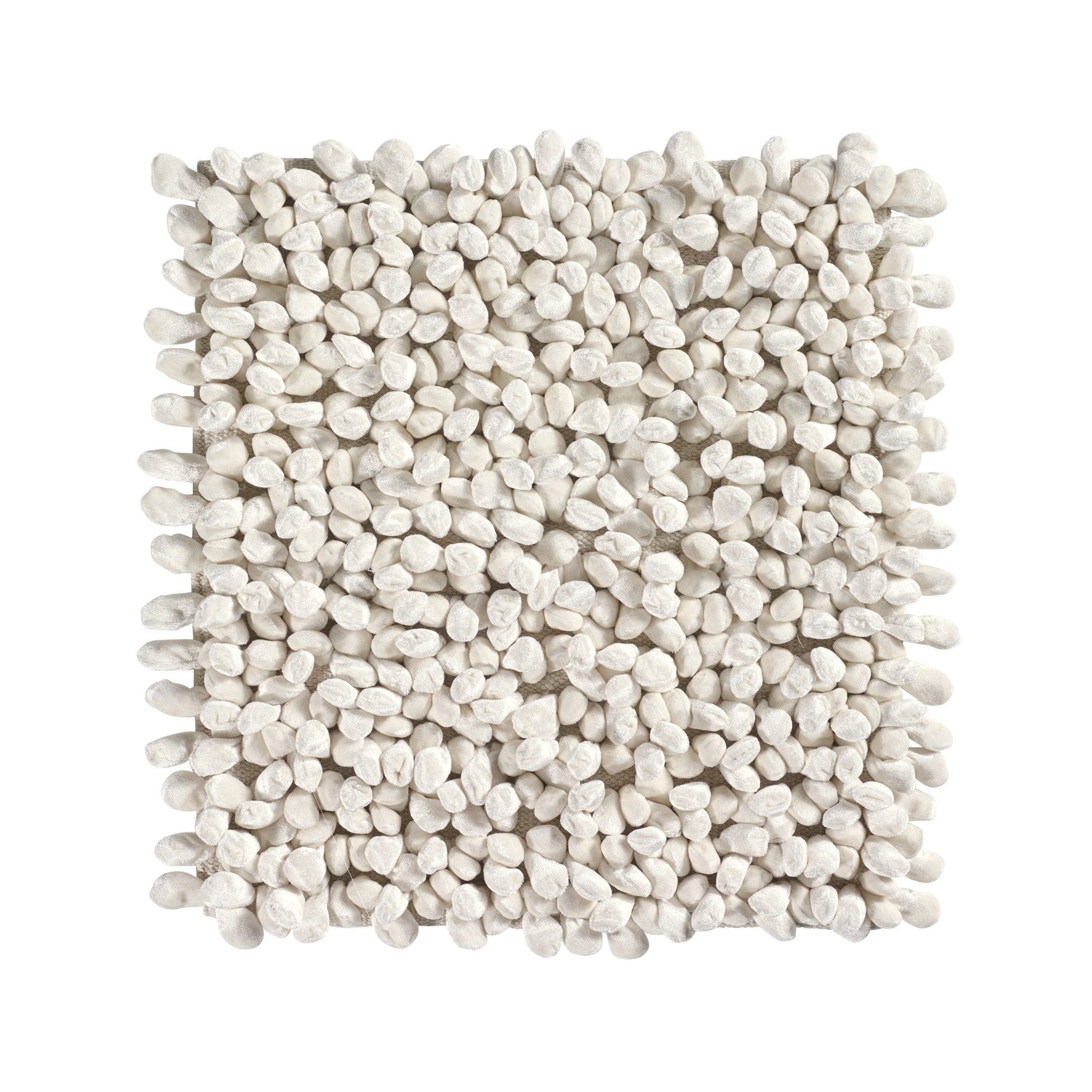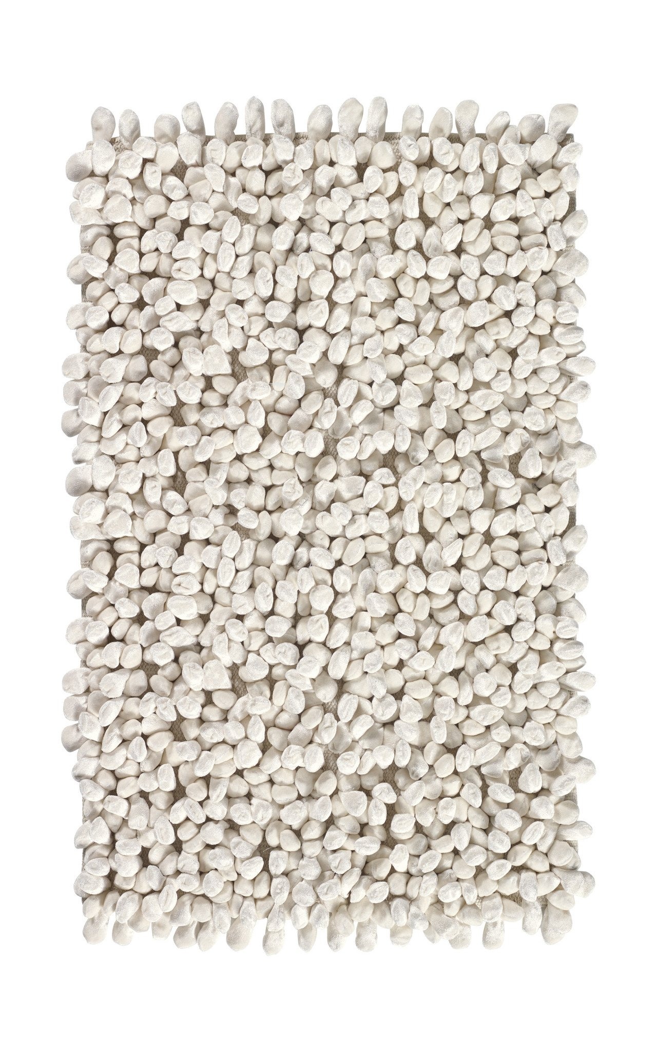 Tapis de bain de luxe Rocca en blanc ivoire. Les clous brillants et veloutés créent des effets d'ombre et de couleur ludiques et rappellent en quelque sorte des galets. Le tapis est fabriqué à la main à partir de 26 % de coton et 74 % de polyester et a une qualité lourde de 3 525 grammes/m². De par son poids, le tapis de bain reste en place, même s'il est dépourvu d'antidérapant. Très agréable à combiner avec des formes rondes et organiques. Ou bien pour attirer le regard dans un espace élégant et moderne.