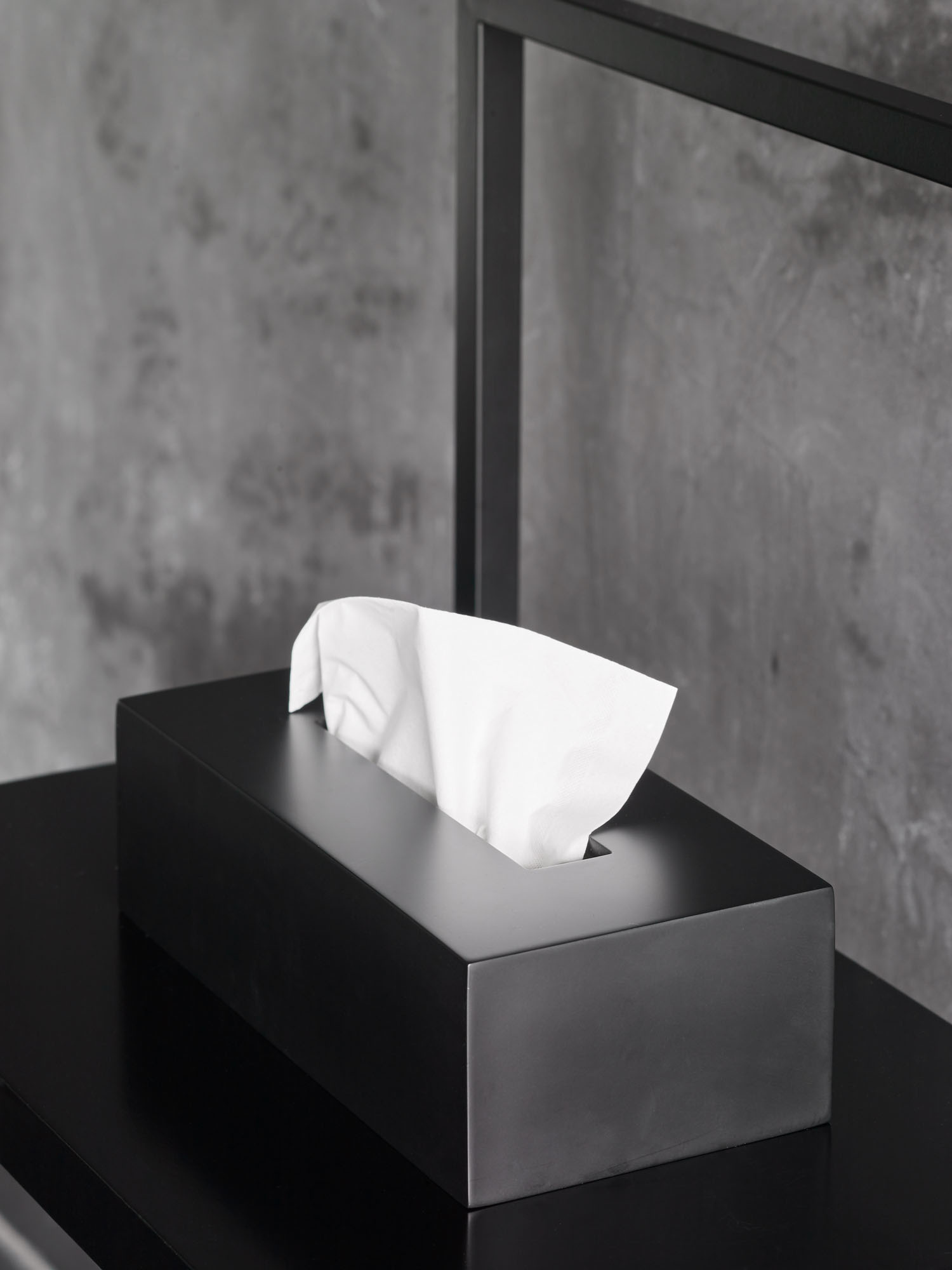 Porte-mouchoirs Aquanova MOON (MOOTIL-09) couleur noir. Dimensions 26x13 cm pour une hauteur 8 cm. La boîte à mouchoirs a un fond ouvert et peut donc facilement être glissée sur une boîte de mouchoirs en carton. ...Informations additionnelles