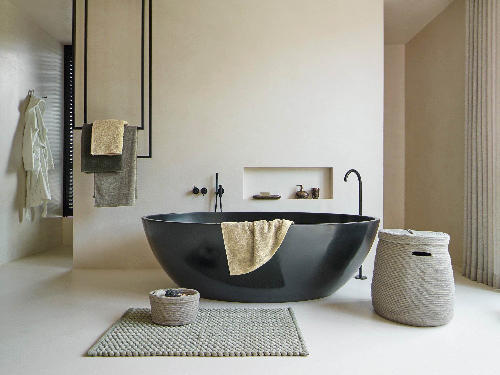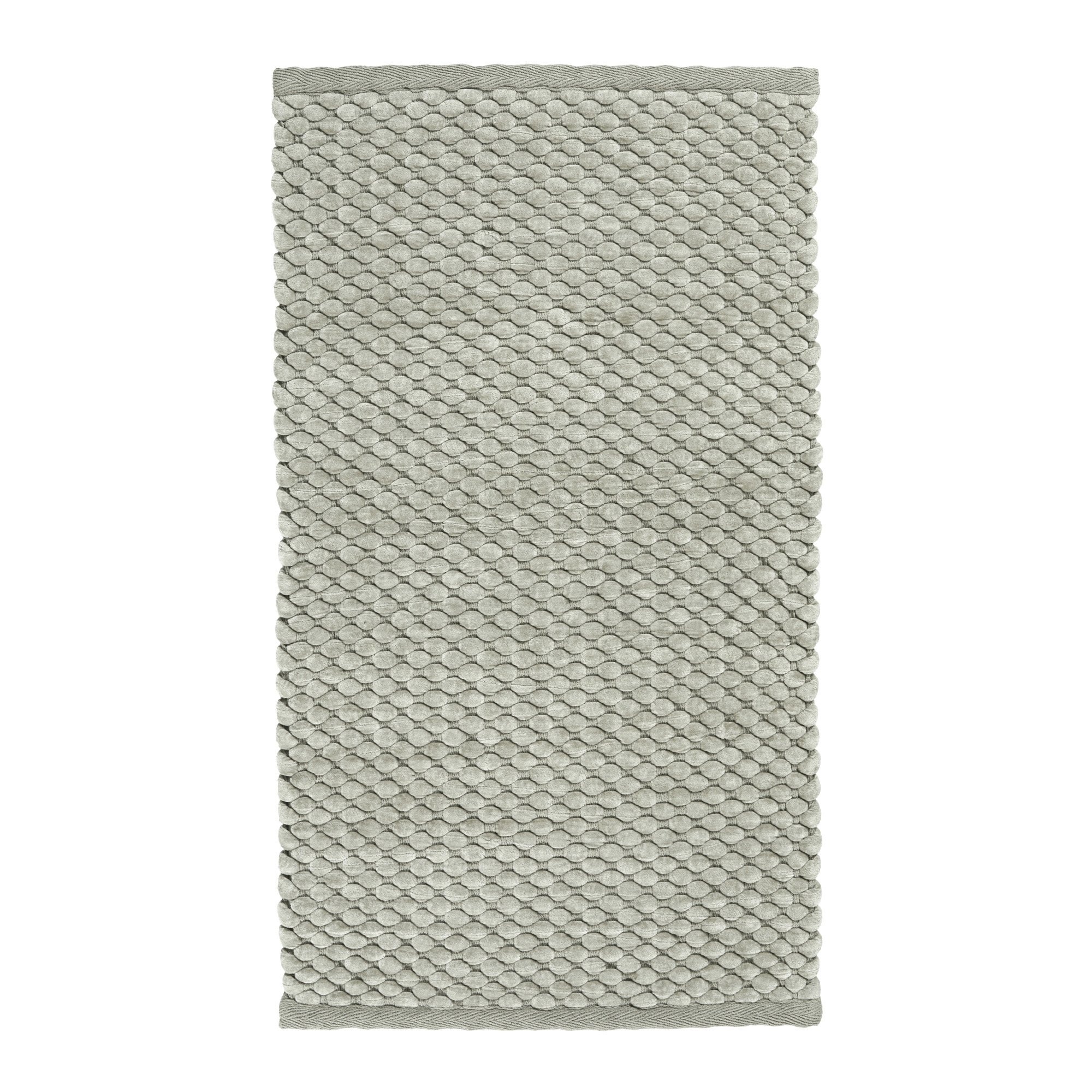 Le tapis de bain Maks est un tapis robuste fabriqué à la main qui peut être utilisé des deux côtés. Le tissu utilisé a une finition mate, faisant apparaître différentes nuances de couleurs dans le tapis. Ce tapis de bain n'est pas antidérapant.