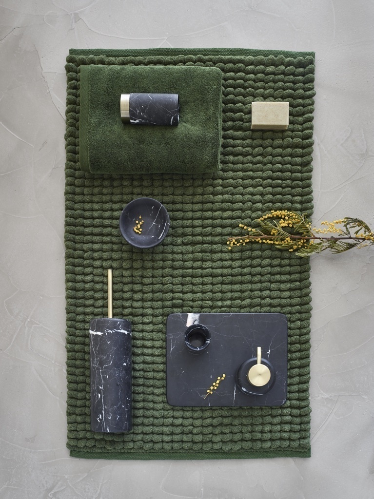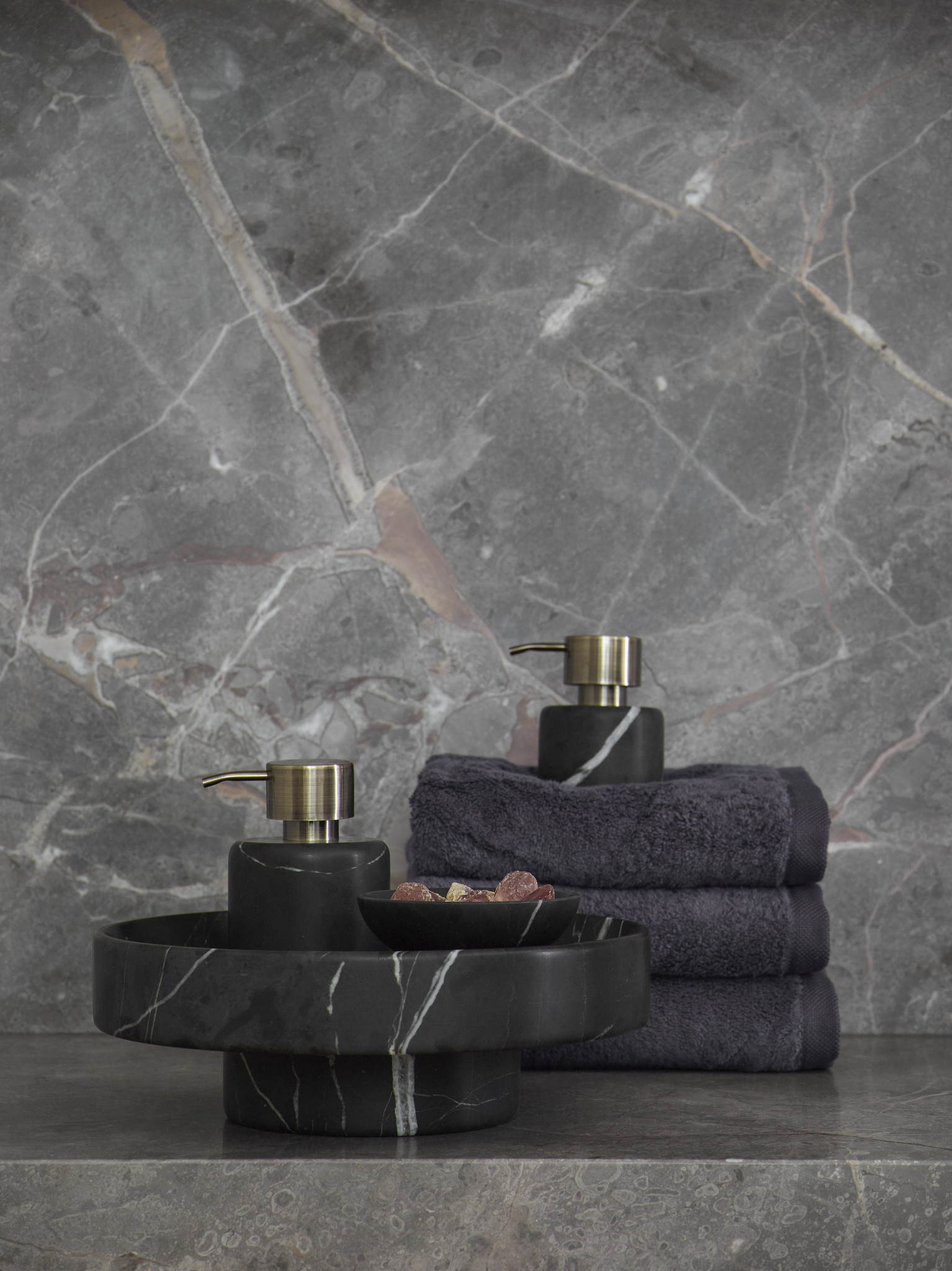 Le plateau rectangulaire de la série Nero d'Aquanova est fabriqué à la main et présente un aspect luxueux. Cela est dû à la pierre naturelle aux marbrures chics. Le plateau est doté de picots en silicone sur le fond pour éviter les rayures et le glissement.