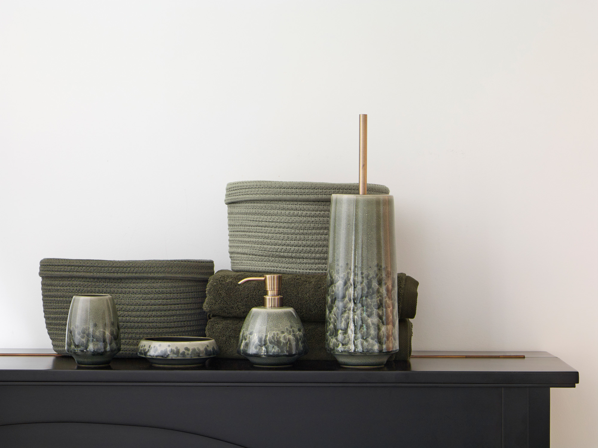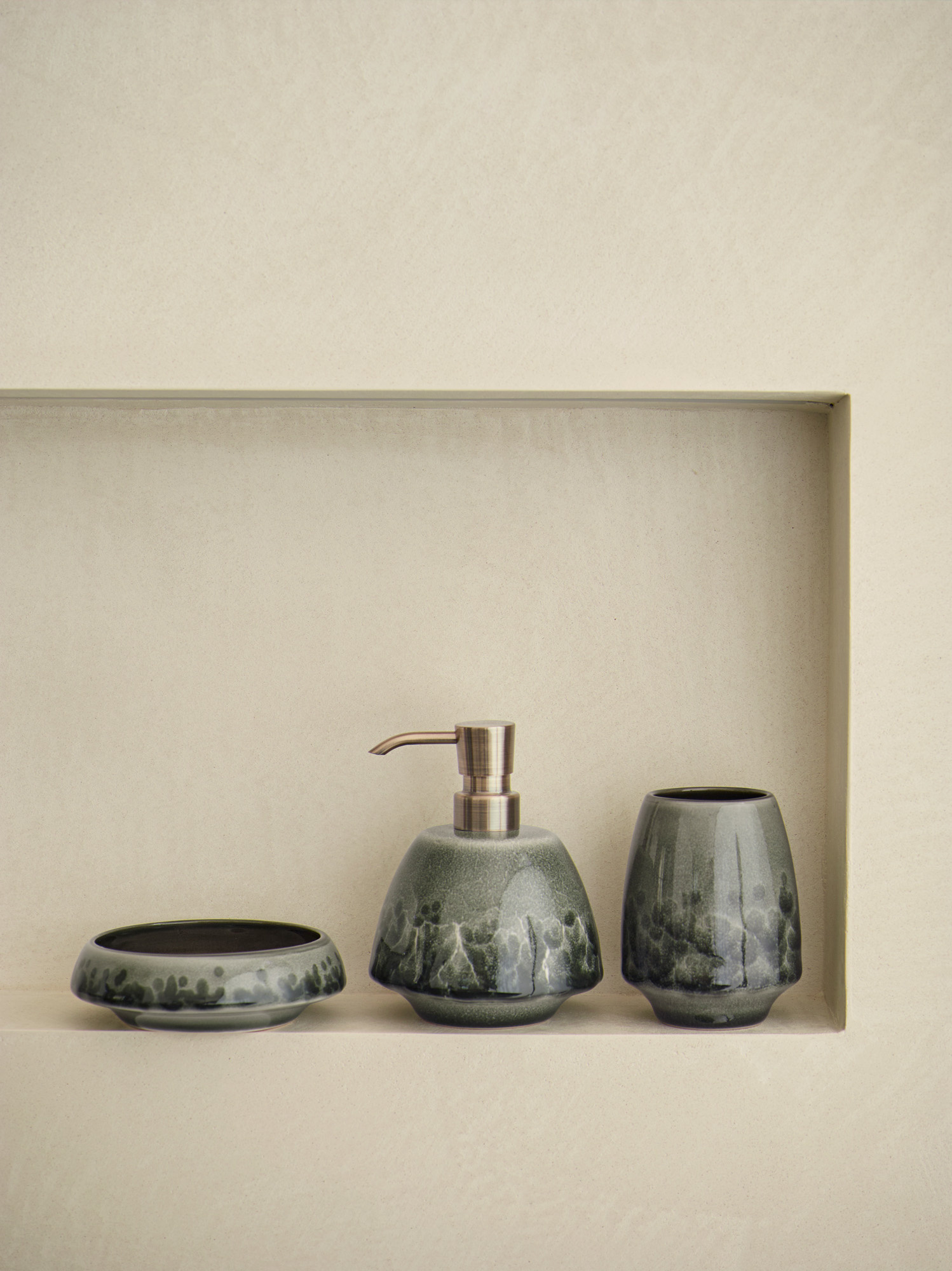 Stijlvolle zeepdispenser uit de Figo serie van Aquanova. De zeeppomp is gemaakt van geglazuurd stoneware (steengoed) in een groene kleur. Het reactief glazuur geeft de houder van keramiek een uniek gevlekt effect. De pompkop van de zeepdoseerder is gemaakt van RVS.